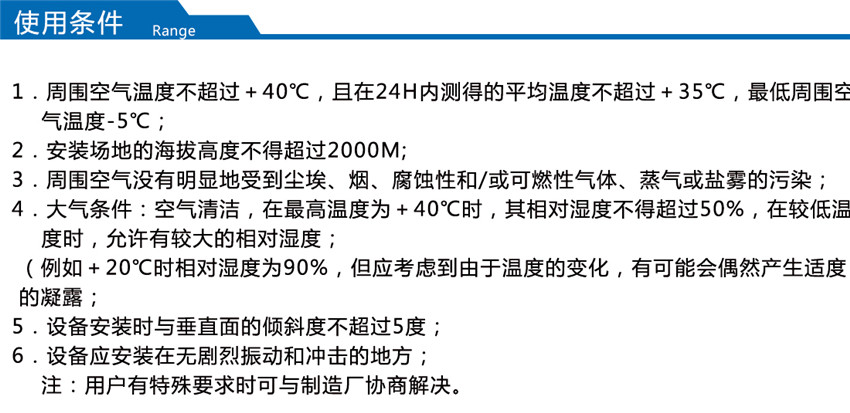 2. 大氣條件:空氣清潔,相對濕度在最高溫度+40℃時不超過50﹪;在較低溫度時允許有較高的相對濕度,例如20℃時為90﹪,但應(yīng)考慮到由于溫度的變化,有可能會偶然地產(chǎn)生適度的凝露。