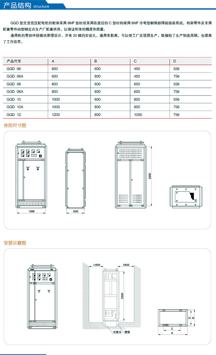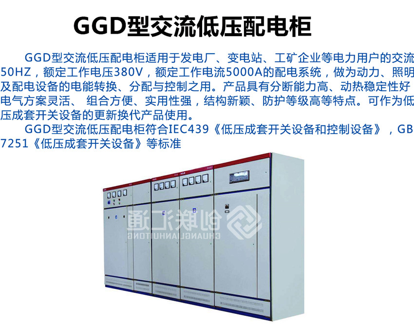 GGD型交流低壓配電柜是根據(jù)能源部主管上級(jí),廣大電力用戶(hù)及設(shè)計(jì)部門(mén)的要求,本著安全、經(jīng)濟(jì)、合理、可靠的原則設(shè)計(jì)的新型配電柜。產(chǎn)品具有分?jǐn)嗄芰Ω?,?dòng)熱穩(wěn)定性好,電氣方案靈活、組合方便,系列性、實(shí)用性強(qiáng),結(jié)構(gòu)新穎、防護(hù)等級(jí)高等特點(diǎn),可以作低壓成套開(kāi)關(guān)設(shè)備的更新?lián)Q代產(chǎn)品使用。并且廣泛適用于發(fā)電廠(chǎng)、變電所、工業(yè)企業(yè)等電力用戶(hù)作為交流50HZ,額定工作電壓380V,額定電流至3150A 的配電系統(tǒng)中作為動(dòng)力,照明及配電設(shè)備的電能轉(zhuǎn)換、分配與控制之用。該產(chǎn)品分?jǐn)嗄芰Ω?,額定短結(jié)構(gòu)新穎等特點(diǎn)。該產(chǎn)品是我組裝式、固定面板開(kāi)關(guān)柜的代表產(chǎn)品之一。