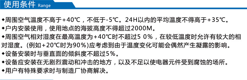 裝置適用于發(fā)電廠(chǎng)、石油、化工、冶金、紡織、高層建筑等低壓配電系統(tǒng)。海拔高度不超過(guò)1000m;周?chē)h(huán)境溫度-25℃ - +40℃;無(wú)導(dǎo)電性塵埃、腐蝕性氣體和水蒸氣的場(chǎng)所;無(wú)火災(zāi)和爆炸危險(xiǎn)的場(chǎng)所;無(wú)經(jīng)常性劇烈震動(dòng)場(chǎng)所。