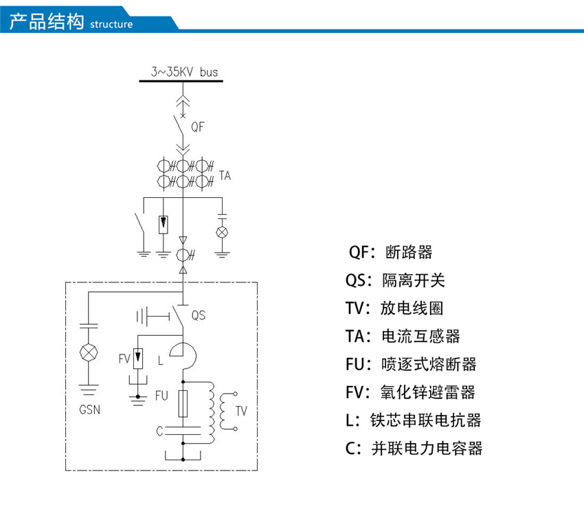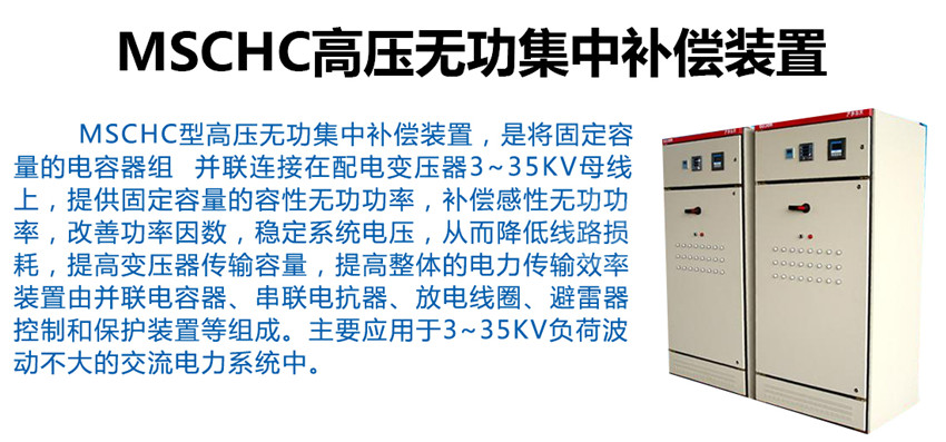 MSCHC型高壓無(wú)功集中補(bǔ)償裝置,是將固定容量的電容器組 并聯(lián)連接在配電變壓器3~35kV母線(xiàn)上,提供固定容量的容性無(wú)功功率,補(bǔ)償感性無(wú)功功率,改善功率因數(shù),穩(wěn)定系統(tǒng)電壓,從而降低線(xiàn)路損耗,提高變壓器傳輸容量,提高整體的電力傳輸效率。裝置由并聯(lián)電容器、串聯(lián)電抗器、放電線(xiàn)圈、避雷器、控制和保護(hù)裝置等組成。主要應(yīng)用于3~35kV負(fù)荷波動(dòng)不大的交流電力系統(tǒng)中