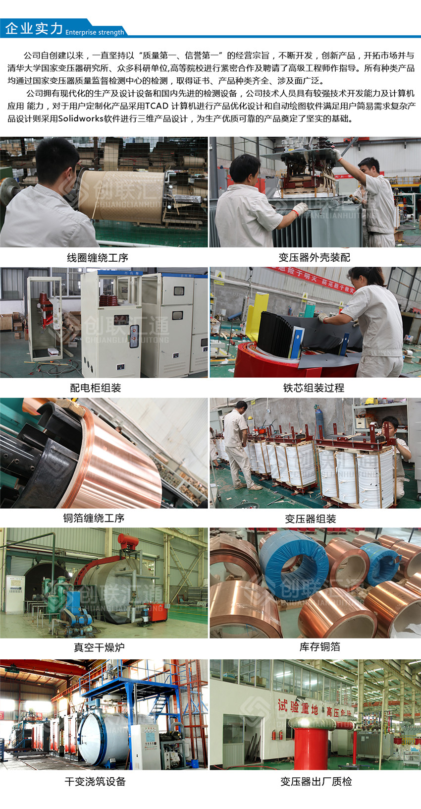 高壓繞組用帶填料環(huán)氧樹脂真空澆注,局放量小,線圈電氣強(qiáng)度高,繞內(nèi)外壁用玻璃纖維網(wǎng)絡(luò)格板增強(qiáng),增加了線圈的機(jī)械強(qiáng)度,提高了產(chǎn)品抗突短路的能力,線圈永不開裂。